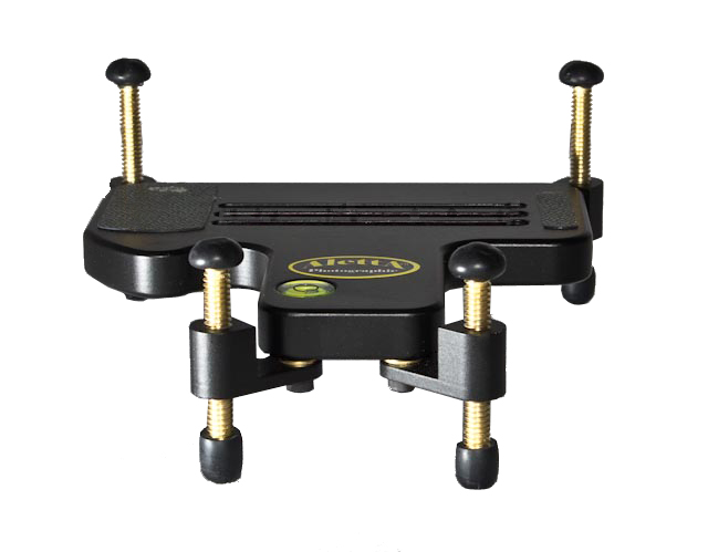 This is the top view of the Basic Stabilizer G-II. Note the three slots, they allow mounting of any Digital cameras, from Pentax, Canon, Nikon, Olympus, Sony and others. The green material is called "egrips" and it keeps the camera from sliding out of position. The bubble level helps in leveling the camera.